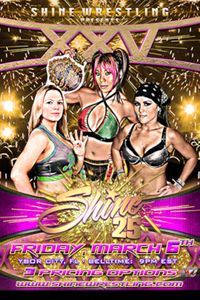 SHINE Wrestling presents SHINE 25, Ybor City, FL, 3/6/2015. Matches include: • SHINE Championship Match – Two-Out-Of-Three Falls Mia Yim defends vs. Nevaeh w/ So Cal Val & Andréa • SHINE Tag Team Championship Match – Titles Can Change On A DQ! Legendary of Malia Hosaka & Brandi Wine w/ Leilani Kai & Thunderkitty vs. The Kimber Bombs of Kimber Lee & Cherry Bomb • NWA World Women’s Championship Match Santana defends vs. Shanna • Jessicka Havok vs. Su Yung • Allysin Kay vs. Leah Von Dutch • Taylor Made vs. La Rosa Negra • Leva vs. Amber Gallows vs. Thunderkitty w/ Leilani Kai • Valifornia of Jayme Jameson & Andréa w/ So Cal Val vs. Daff’s A.S.S. of Solo Darling & Crazy Mary Dobson w/ Daffney.