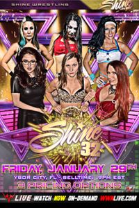 SHINE 32, Ybor City, FL, 1/29/2016. Matches include: SHINE Championship Match Taylor Made w/ So Cal Val & Andrea defends vs. Santana • Allysin Kay vs. Su Yung w/ So Cal Val & Andrea • Open Challenge Match Vanessa Kraven vs. Luscious Latasha • NWA World Woman’s Championship Match Amber Gallows defends vs. Leva • SHINE Tag Team Champion Jayme Jameson w/ So Cal Val & Andrea vs. Kimber Lee • Impromptu Tag Team Match Legendary of Malia Hosaka & Brandi Wine w/ Lelani Kai vs. Thunderkitty & Amanda Carolina Rodriguez • Renee Michelle vs. Barbi Hayden • Crazy Mary Dobson vs. Amy Love • Jessicka Havok vs. Andrea w/ So Cal Val.