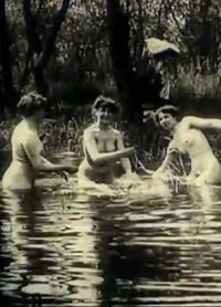 Three young women are smiling and playing in a lake, their nude bodies reflecting in the water, when a forest watcher appears from the wood, and chases them away. They get out of the water, pick their clothes from tree branches, and move away before putting them on. The bearded man seems to be shy, but he is chasing after them through the wood, anyway. the circular movement of that water.
