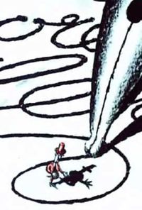 An amorous but jealous couple interacts with letters and musical notes, and also with each other.