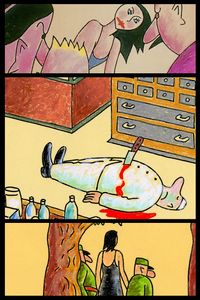 A young girl, cutting her bread, cuts herself. She runs to the chemist but he has just been murdered.